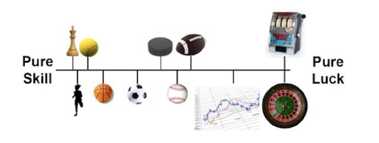 在不同的活动中,这两个因素的比例可能会有很大差异。我们可以画一条线,技能写在最左边,运气写在最右边,不同的活动可能落在不同的点上——越靠左,越依赖技巧,越不依赖运气;越靠右,越依赖运气,越不依赖技巧。在极端情况下,有些活动完全依靠技巧而不是运气,例如国际象棋或学习跑步;而其他活动则完全依靠运气,与技巧无关,比如买彩票。